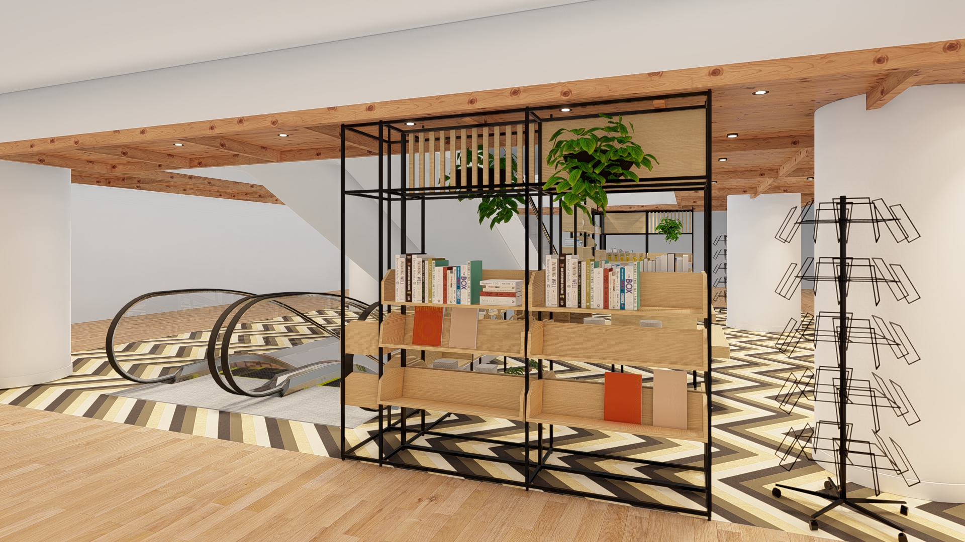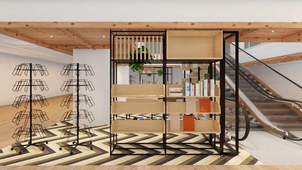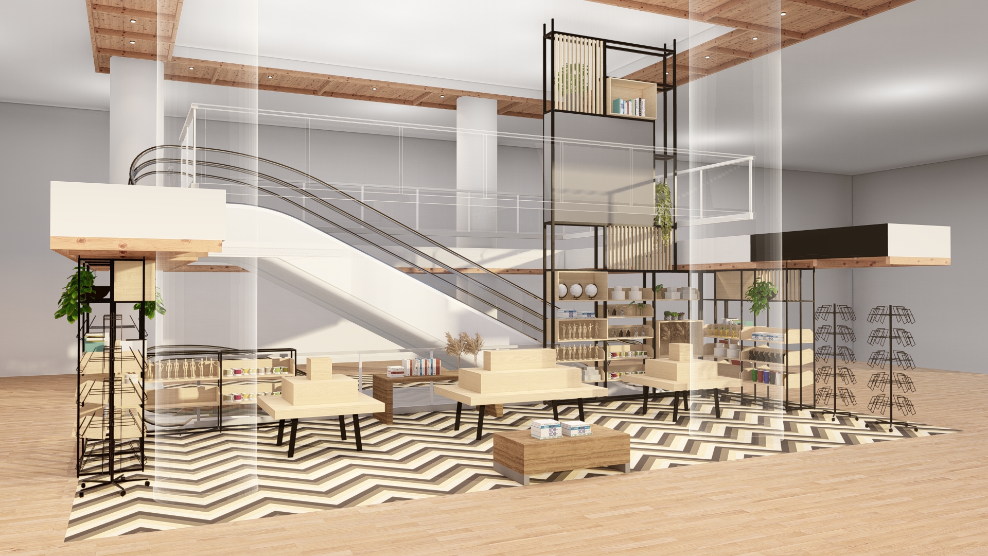 Regale & Raumaufteilung: Maßgefertigte Regale aus schwarzem Metall mit Holzakzenten strukturieren die Fläche und schaffen fließende Übergänge zwischen Zonen.
