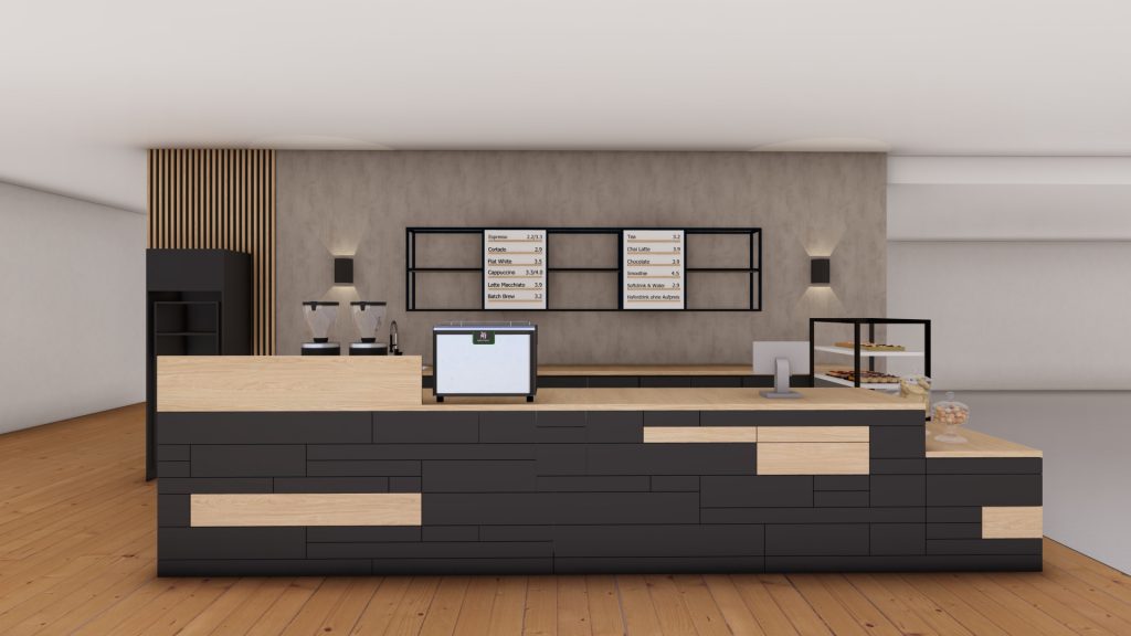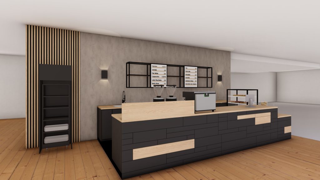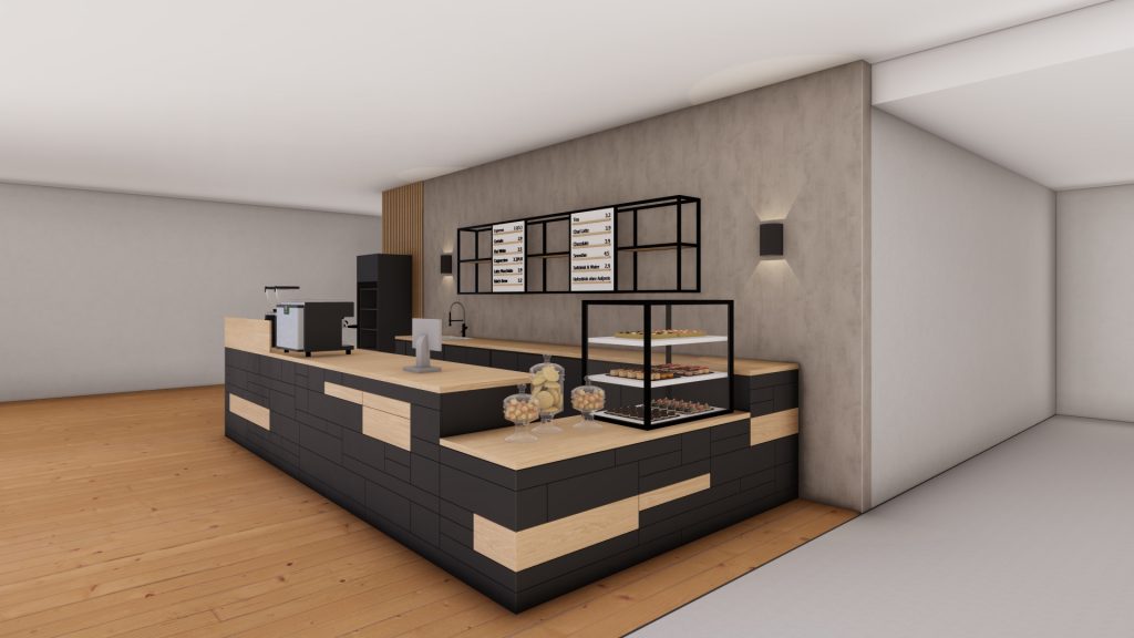 Café Kiel - Die Gestaltung des Cafés in Kiel folgt einem klaren, minimalistischen Ansatz mit warmen Holz- und Schwarztönen, die dem Raum eine einladende, professionelle Ausstrahlung verleihen. Die Linienführung ist modern und funktional – mit Fokus auf Ergonomie, Abläufe und Kundenerlebnis.