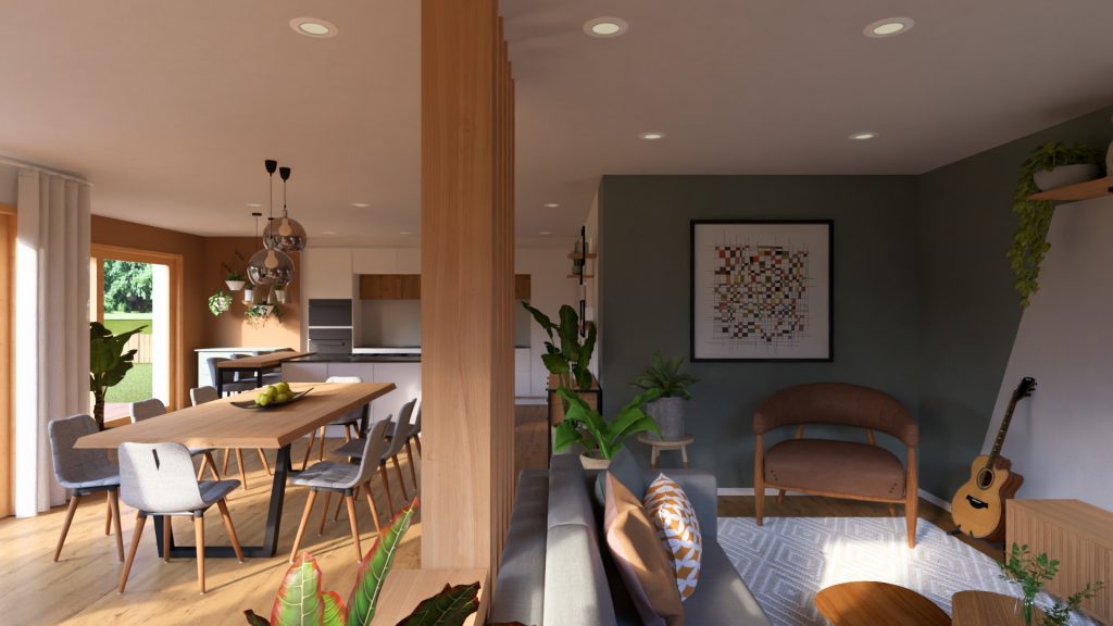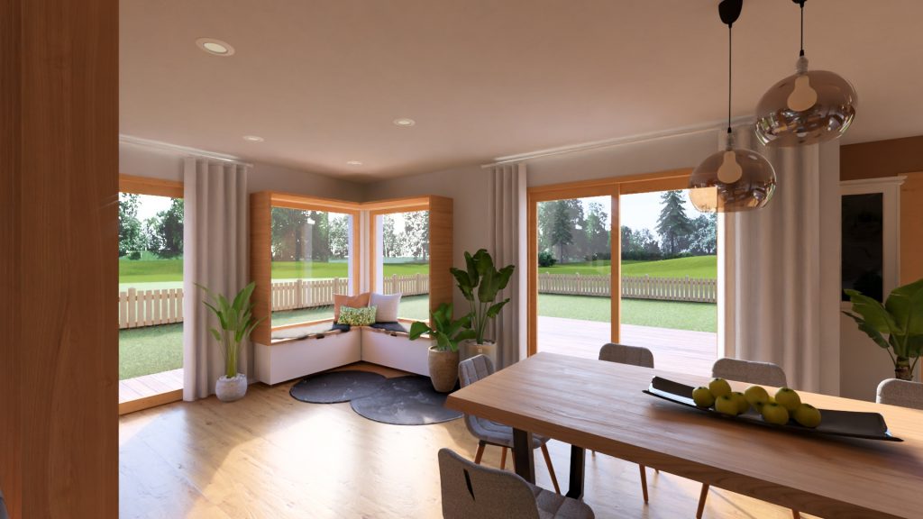 Offener Wohn- und Essbereich mit bodentiefen Fenstern