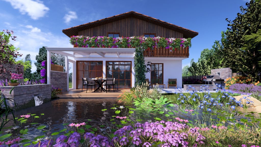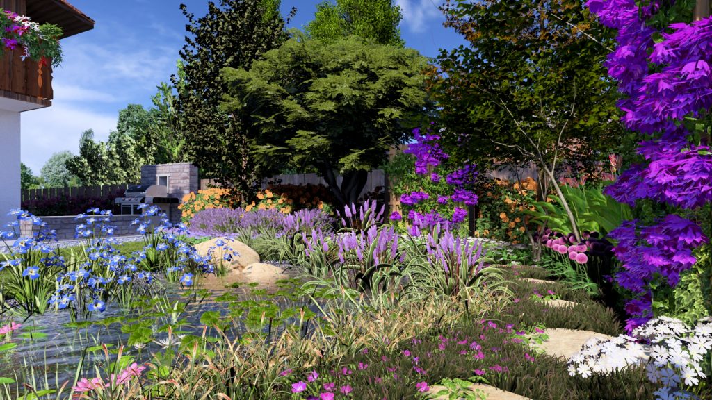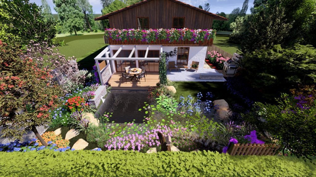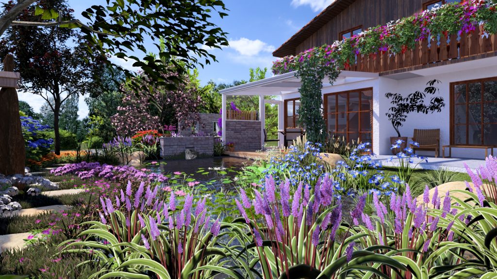 Der Teich spiegelt das Sonnenlicht, während Lavendelduft und das leise Plätschern des Wassers eine beruhigende Atmosphäre schaffen. Die Blütenvielfalt bietet nicht nur optische Reize, sondern zieht auch Schmetterlinge und Bienen an – ein perfekter Rückzugsort mit natürlichem Charme.