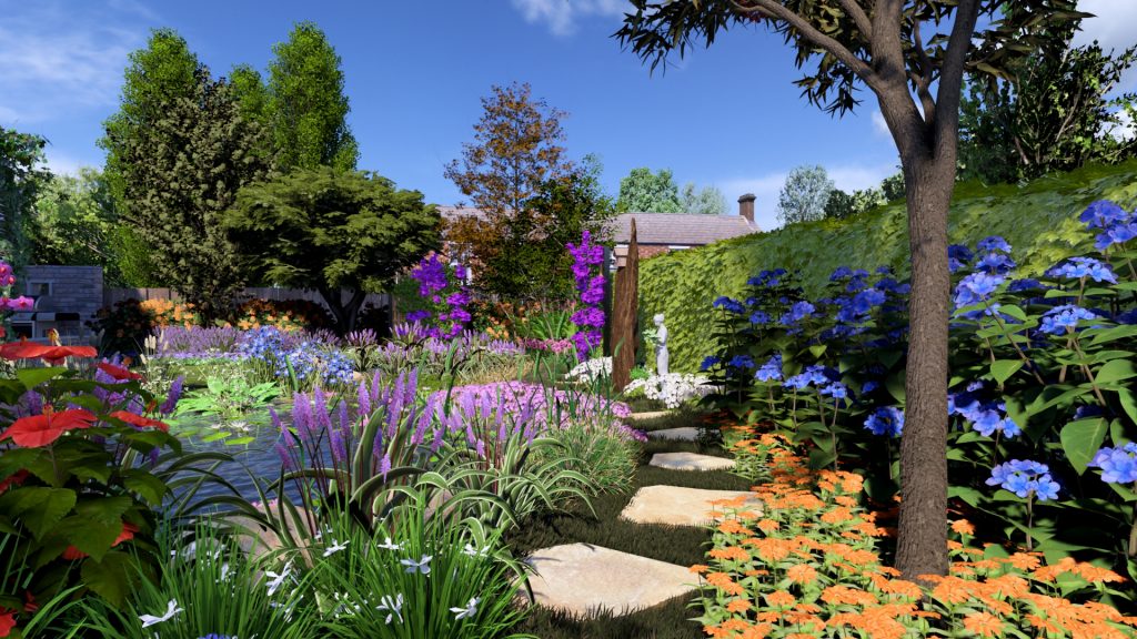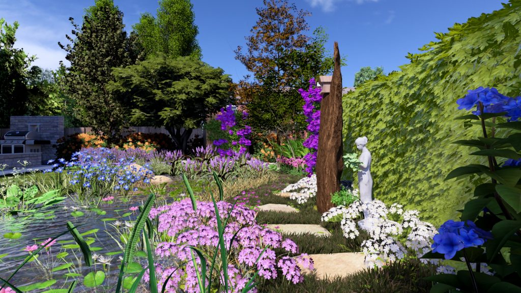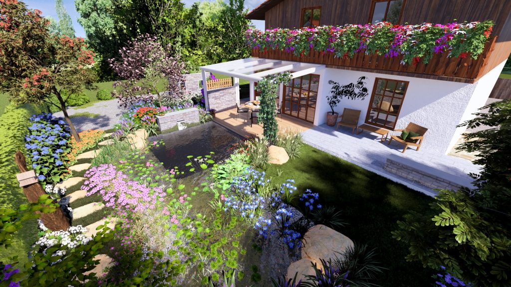 Die organischen Formen des Teiches, die farbintensive Bepflanzung und die gemütlichen Sitzbereiche wurden harmonisch miteinander abgestimmt, um eine lebendige, aber gleichzeitig entspannende Atmosphäre zu schaffen.