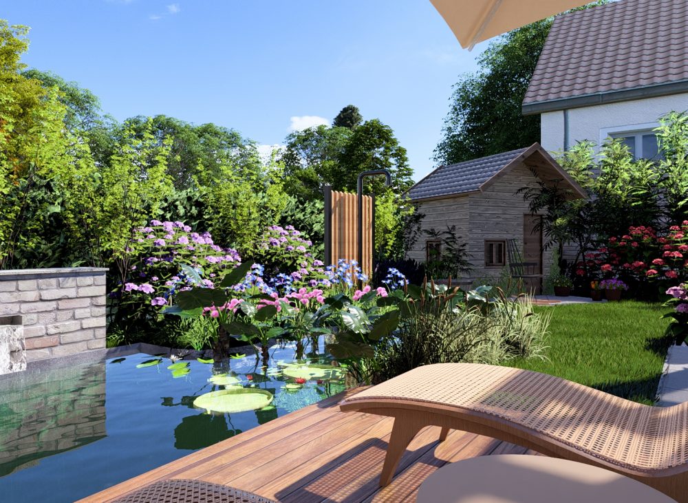 Ein harmonisch gestalteter Garten, der trotz kompakter Fläche Ruhe, Natürlichkeit und Luxus vereint.