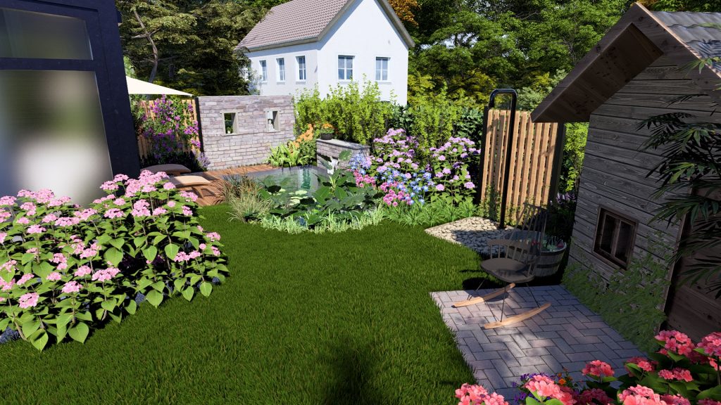 Ein harmonisch gestalteter Garten, der trotz kompakter Fläche Ruhe, Natürlichkeit und Luxus vereint.