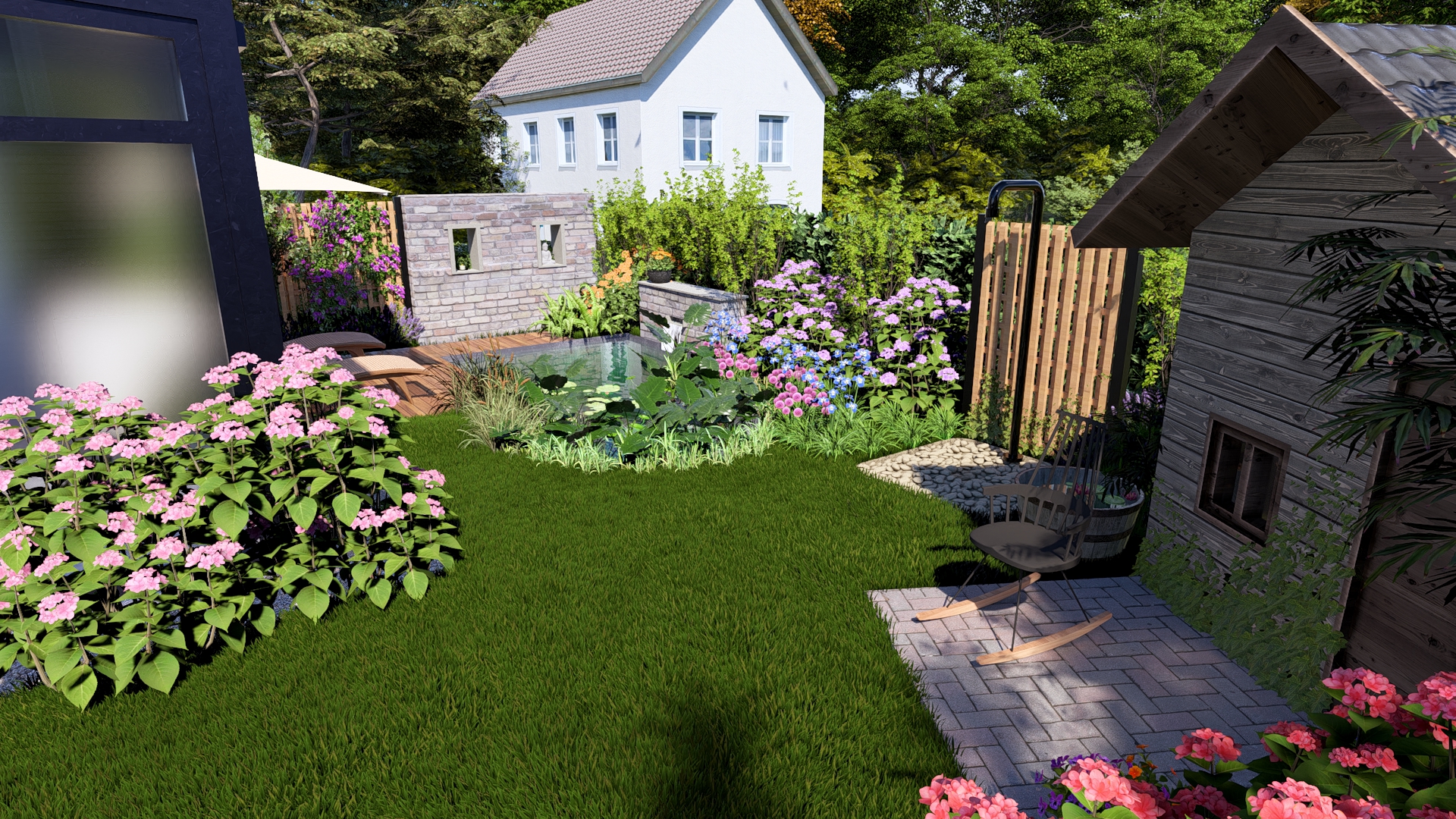 • Üppige Bepflanzung mit Lavendel, Hortensien und Seerosen